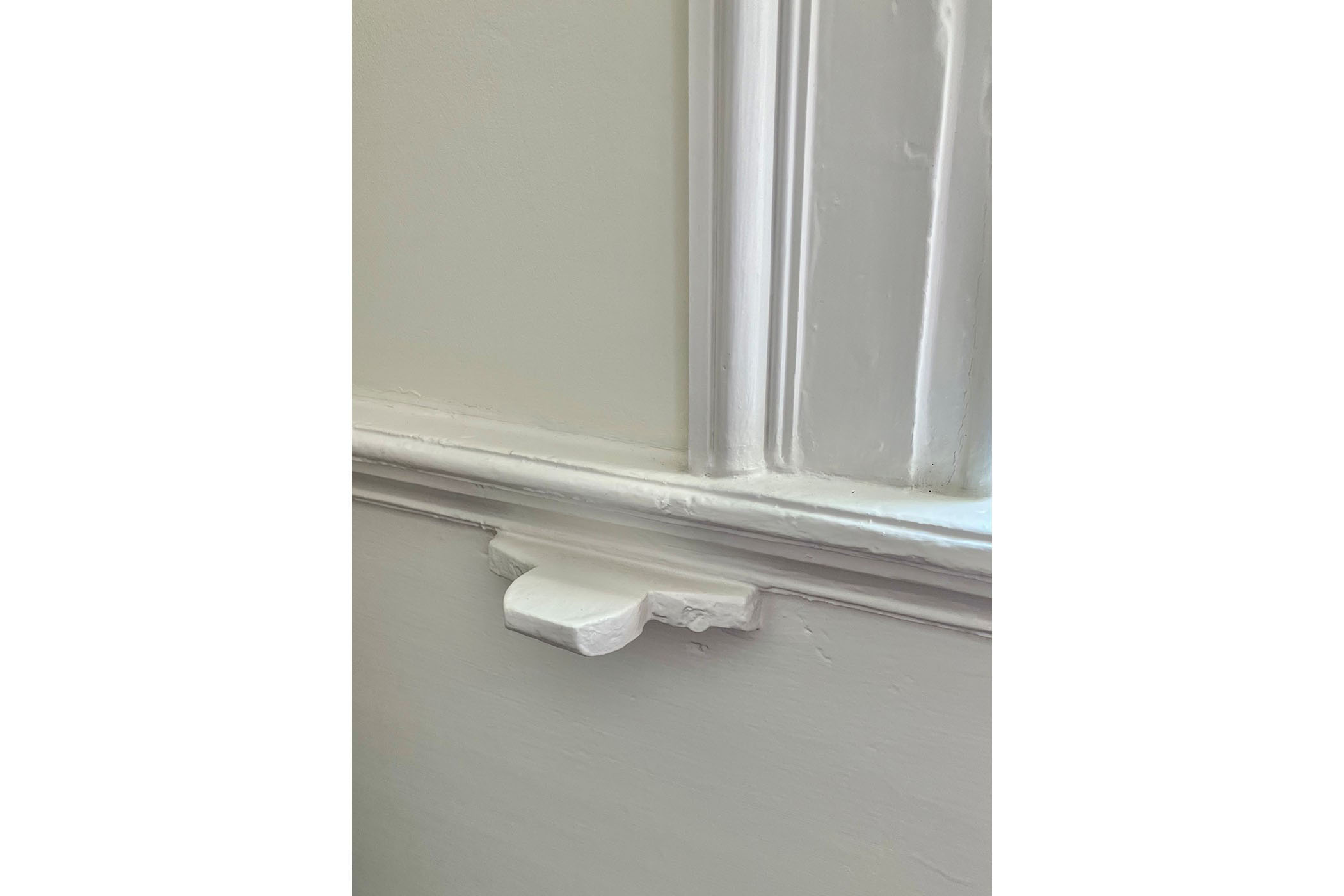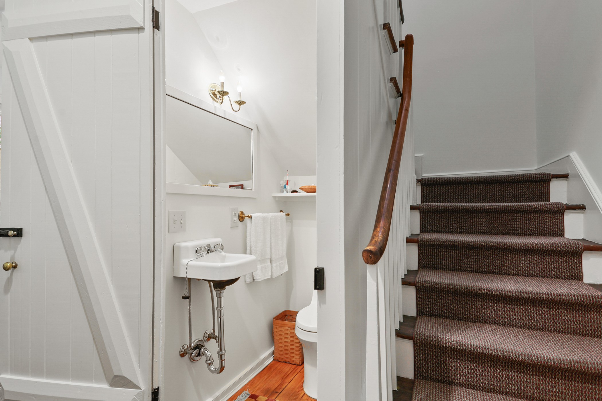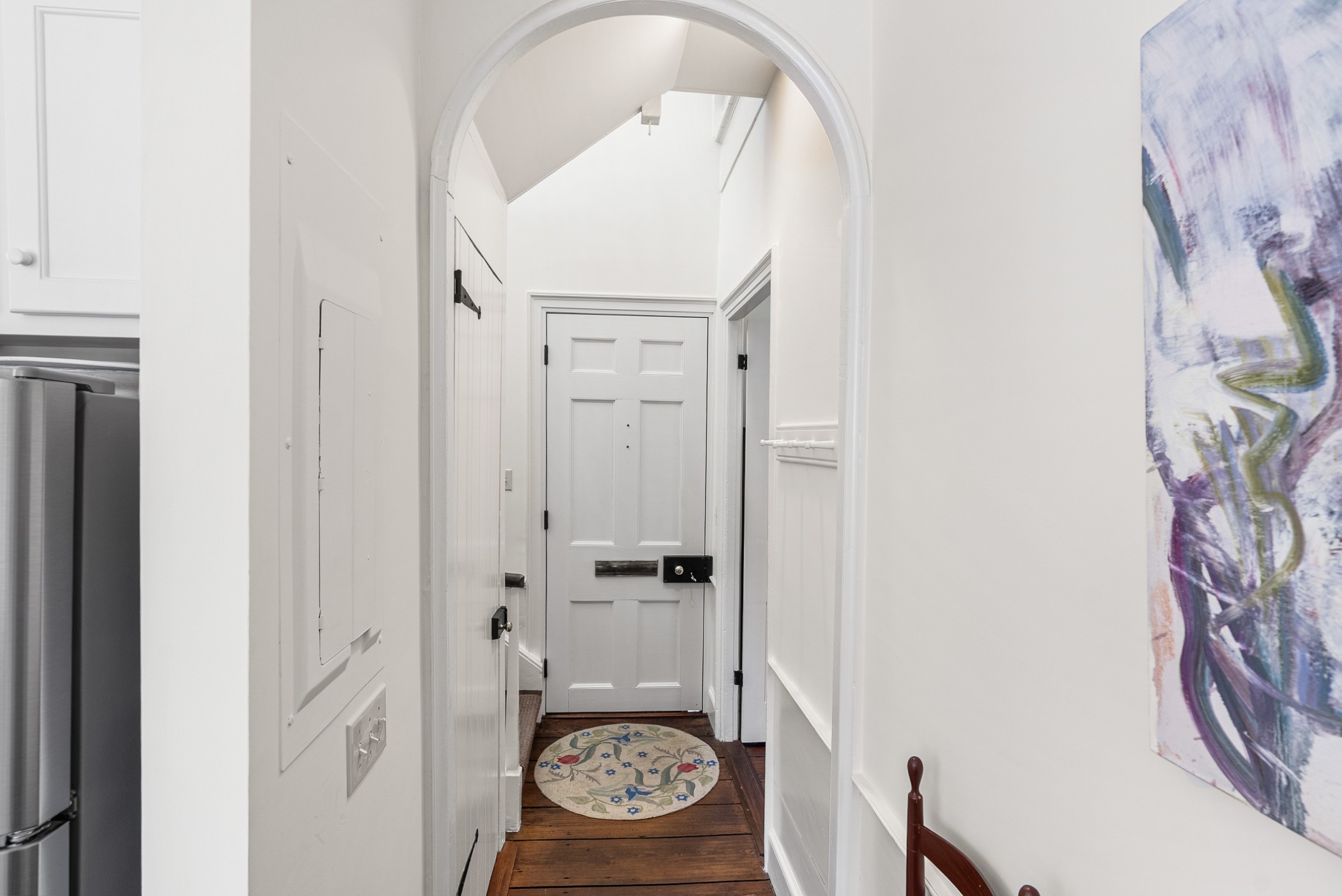 The house has substantial original fittings including rare 12 over 12 window sashes, two mantels, the staircase, a lovely archway with a lantern hook in the front hall, most of the woodwork, with wainscoting and pine flooring throughout.
